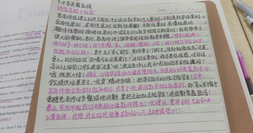 今天很荣幸地聆听了苏英霞老师的“国际中文语法教学的九大原则”主题讲座,受益颇多。首先于我个人而言,本次讲座的内容完美解决了我上学期学完《现代汉语(下)》之后的遗留问题:语法教学怎么教?因为作为一个中国人,我很惭愧,我自己的语法其实并没有那么精细、精密,有时候也会犯一些错误。但是苏老师的讲座却为我提供了很多很新很好的思路,我相信这对于我未来的发展有很大的帮助!其次,这次讲座让我明白了,在削弱语法教学的语言教学背景大趋势之下,语法教学依旧不可或缺,甚至它比我们想象的更为重要。一个小小的语法竟然蕴含着这么大的学问与智慧,由此也可见汉语国际教育真不是一门“小儿科”而是一门“大学问”!在今天的讲座中我启发最深的部分是老师讲到的“交际性原则”部分,因为在此之前我从来没有考虑过语法教学需要最终服务于交际、语用,可能在答题的时候会答出来,但是这个意识还是不够强,还是没有深入理解语言是一门工具的深刻内涵。